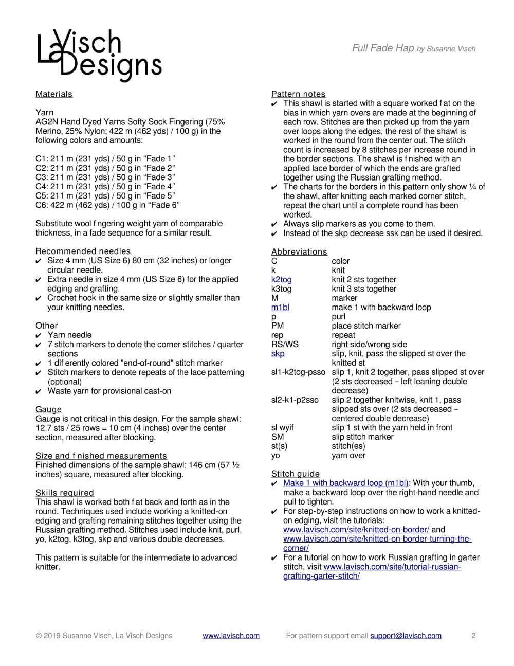 Change the size of this shawl by using lighter or heavier yarn and/or working fewer (or more) repeats of the various sections in the body of the shawl. This will, of course, change the amount of yarn needed.