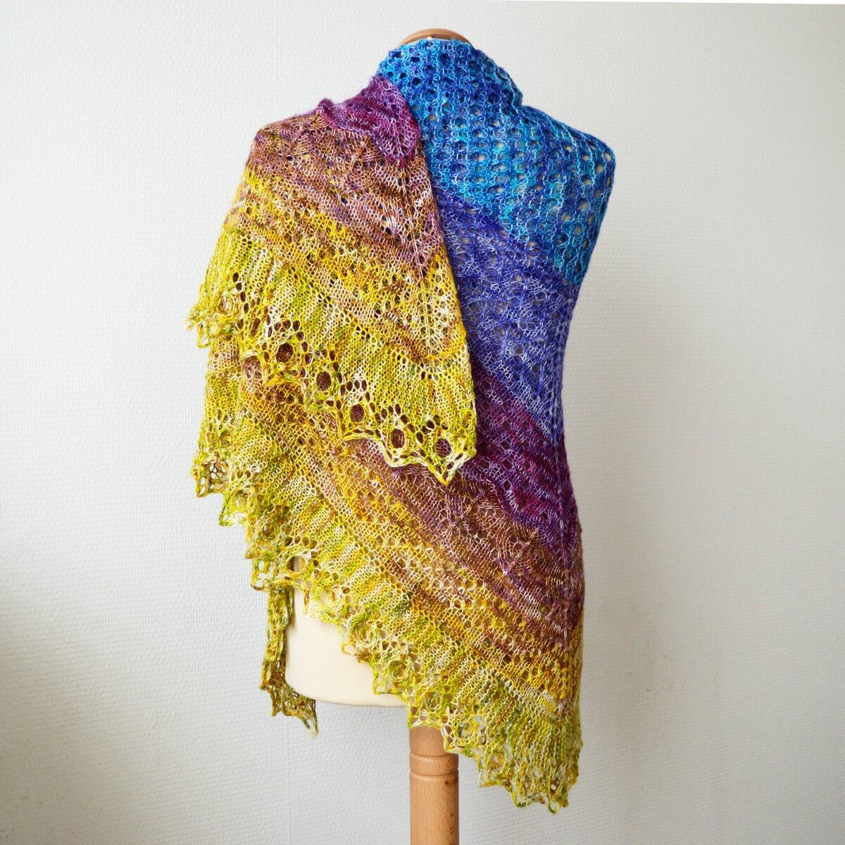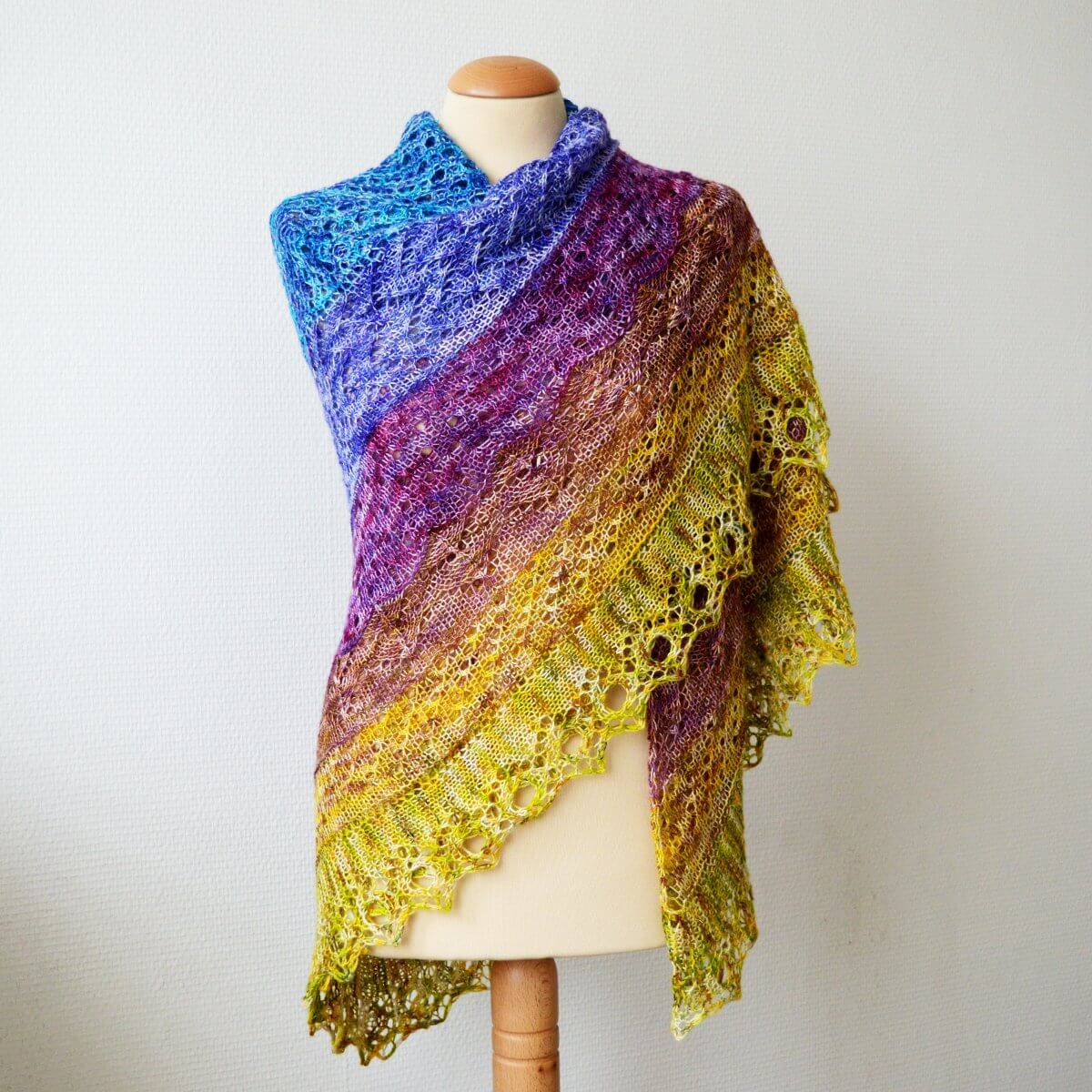 Finished dimensions of the sample shawl: Span width of 186 cm (73 ¼ inches) along the upper edge and a max. depth of 91 cm (36 inches), measured after blocking.