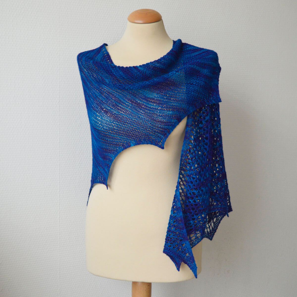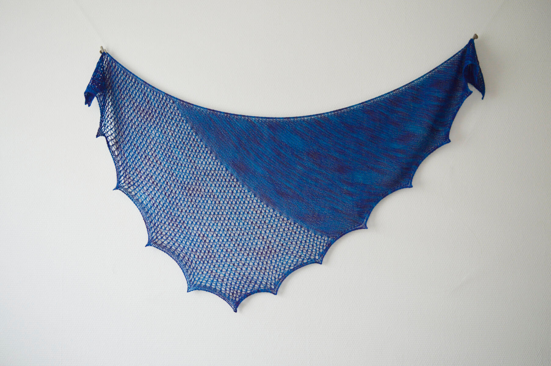 Finished dimensions of the sample shawl: Span width of 158 cm (62 ¼ inches) along the upper edge and a depth of 76 cm (30 inches), measured after blocking.