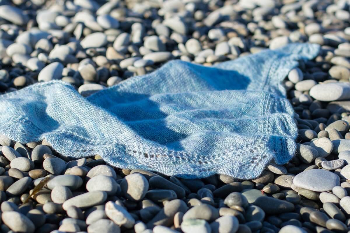 Sometimes when I think of summer, I get this picture of a turquoise sea, rolling gently over a white sandy beach. Imagine the heat of the sun and the cool breeze carrying the scent of salt. This image of summer bliss is what inspired me to design the Zomer Zilt shawl, which is just right to throw on when the sun goes down and the air becomes a tad chilly. Knitted from the top down, with only 100 g of fingering weight yarn, it’s the perfect summer project.