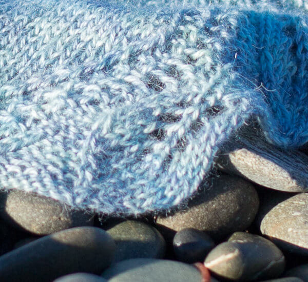 Stormy Seas is a half circle shawl, featuring Sea Foam lace. It shows off variegated and self striping yarns with long to medium lengths of color wonderfully. Combined with the all-over garter stitch, it gives an airy, textured, reversible fabric. While my version is in a hand spun yarn, it can, of course, also be knit with a commercial yarn. Make the shawl as small or large as you like, just knit until your yarn runs out!