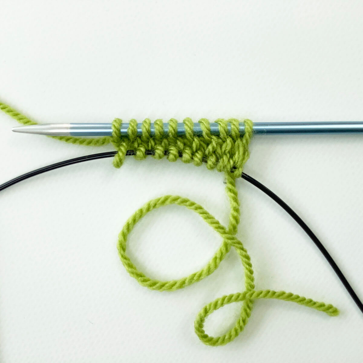 - Now use the pulled-out needle tip as your working (right-hand) needle to knit into the first stitch on the main (left-hand) needle.