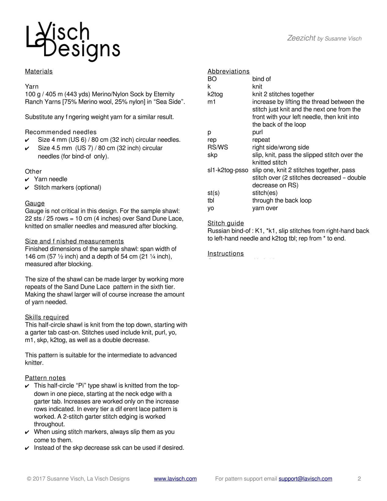 - Gauge is not critical in this design. In the sample shawl: 22 sts / 25 rows = 10 cm (4 inches) over Sand Dune Lace, knitted on smaller needles and measured after blocking.